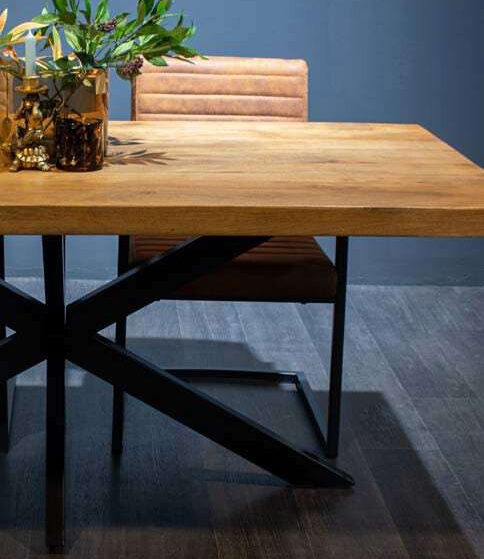 Deze prachtige vierkante tafel van 160 cm is gemaakt van massief mango hout met hieronder zwart stalen spinpoten.